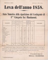 Leva dell'anno 1858 stato numerico della repartizione del contingente di 1ma categoria fra i Mandamenti