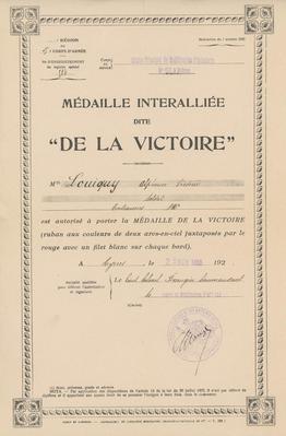 [Autorisation de port de la Médaille interalliée dite "De la Victoire" décernée à Alphonse Frédéric Louiquy ]