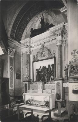 225 Eglise de PUGET-THENIERS (Alpes-Maritimes), boiseries du XVIIIe siècle représentant la mise au tombeau de N S. La Vierge quittant le Calvaire, la résurrection de N.S;