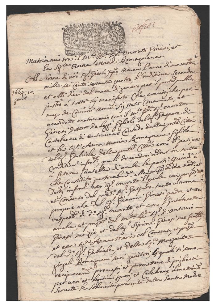"Matrimonio tra il Monsigniore Onorati GINESI et la figlia Anna-Maria ROMAGNA" -Acte/contrat de mariage entre Honoré Ginesi et Anna-Maria Romagna