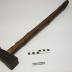 Description : Outil comportant un manche en bois (L : 60 cm) de section elliptique (env 3 x 3 cm) inseré dans une tête en acier, en gros parallélépipèdique. La partie avant (L : 3 cm) présente en bout une surface carrée (4,3 x 4,3 cm), plane. Partie arrière L env 4 cm, Lg/ép 3,8 cm, D surface de frappe env. 5 cm (bavures).