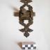Description : Pièce de métal au décor fleurderisé découpée à la presse, avec trous de fixation. Au centre se trouve un taquet avec bouton de préhension.