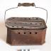 Description : Boîte de tôle de fer de base rectangulaire à coins coupés munie d'un couvercle comportant des trous circulaires et une anse supérieure avec poignée en bois.