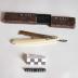 Description : Rasoir repliable par son milieu, un côté est le manche en corne imitant l'ivoire, l'autre est la lame en acier. Le tout est dans un étui cartonné noir.