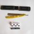 Description : lame d'acier munie d'une poignée en corne jaune. Un axe en bout de lame permet le repli pour pouvoir rentré le rasoir dans un étui muni d'un couvercle.