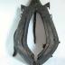 Description : Collier de forme ovale. Deux attelles recourbées dans leur partie supérieure. Elles sont de section rectangulaire. Les bord sont renforcés par une plaque de métal continue vissée. Les crochets sont recouverts de laiton fixé par de petits clous en bordure de la pièce. Deux anneaux pour les rênes sont fixés sur attelle. Sur sa face Avant, l'attelle est munie d'une bande de métal clouée et boulonnée. Le collier s'ouvre sur un système de crochet percé et anneau. Une lanière de cuir fait office de goupille de fermeture. Deux crochets mousquetons sont boulonnées de part et d'autre de attelle. Le coussinet est fait de paille longue comprimé (paille de seigle) dans un étui de cuir. Le sommet est renforcé par une grande pièce de cuir en cône qui réunie les deux attelles. Sur le sommet des deux côtés se trouve un anneau. Une sangle de cuir est cousue autour de l'anneau de la face arrière.