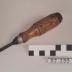 Description : Biseau tranchant monté sur une tige chanfreinée. La soie est noyé. Le manche cylindrique est à gorge et possède une virole. La tête, destinée à être marteler est sertie d'une virole de métal