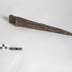Description : Pièce métallique comprenant à une extrémité une pointe à quatre pans et à l'autre une panne à un épaulement. Au centre se trouve un trou ovale dans lequel passaient les volutes. Celles-ci sont des lames en fer, elles traversent l'enclumette et sont recorbées. Elles empêchent l'enclumette de s'enfoncer complètement dans le sol.