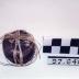 Description : Support cylindrique de carton bleu ouvert de trois encoches incurvées au sommet. Il est décoré en bordure d'un liseré noir et des inscriptions en lettres dorées. Le fil se trouve torsadé à l'intérieur. Une section de fil à l'extérieur est enroulé en croix.