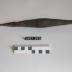 Description : Pièce de bois renflée en son milieu, appointée aux deux extrémités. Elle comprend un embout métallique cranté conique. Il est décoré d'un crénelage à la base puis des stries horizontaux qui encadrent un décor de résille.