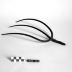 Description : Outil composé de a) : une languette permettant un emmanchement rentrant (L : 7 cm, Lg : 1,2 cm, E : 0,8 cm) perforée d'un trou (D : 0,5 cm) vers son extrémité; b) : 3 dents, les 2 extrèmes dessinant un "U", la centrale étant dans le prolongement de (a). Ces 3 dents pointues sont parallèles, de section circulaire (L : 24 cm, D maxi : 0,8 cm) et définissent un plan incurvé. Ecartement entre les 2 dents extrèmes : 13,8 cm.