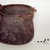 Description : Récipient en cuivre, sur plan circulaire, à fond bombé concave à bords moyens rétrécis et galbé convexe en partie haute. Il se termine par un rebord annulaire. Il est renforcé sur les faces latérales par deux plaques de métal semi-circulaire rivetée sur lesquelles se greffent les montants des anneaux. Ils sont destinés à fixer une anse mobile demi-circulaire. Le fond fendu à plusieurs reprises a été successivement réparé par deux plaques de métal rivetées quadrangulaire sur lesquelles se sont succédées des plaques de dimensions inférieures. Une réparation se distingue. En effet une pièce de cuivre a été dentelée en créneau. Les créneaux se trouvent alternativement à l'avers et au revers du fond pour maintenir cette pièce en place.