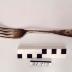 Description : Fourchette à quatre dents avec un manche gravé d'un "X" encadré par des volutes.