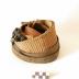Description : La sangle de papier est repliée en "V" aux deux extrémités. A ces extrémités sont cousues deux boucles à passant ainsi qu'une sangle de cuir percée à l'autre extrémité d'oeillets et réalisée manuellement. Le serrage de la sous-ventrière est croisé. La sangle cousue à droite passe dans la boucle de gauche et vis versa. La qualité du cuir d'une des sangles est inférieure.