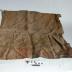 Description : Pièce rectangulaire ourlée à la main tout autour. Ce torchon a été confectionné dans un sac usé en conservant la couture du côté du sac. Une ganse en lacet plat blanc est cousue dans un coin.