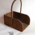 Description : Caisse en bois constituée d'une base horizontale rectangulaire : 34,5 x 23 cm. D'un dos vertical perpendiculaire à la base (23 x 17 cm), de deux flancs verticaux cloués sur le fond (35 x 16 cm). La caisse est munie d'une anse constituée d'une branche cintrée et clouée sur les deux flancs.