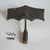 Description : Outil formé d'une plaque rectangulaire formanyt une pointe supérieure au milieu légèrement incurvée ainsi que les deux côtés, la face antérieure est découpée en trois arcs de cercle. Ici la tige manchon est coudée à sa base (L coupe : 2x 15 cm : lg coupe : 9 cm). Face antérieure : 3x10 cm L du manchon : 23,5 cm.