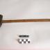 Description : Outil composé de : a/une double tête en acier (L : 10,3 cm), la première tête étant pointue, de section carrée (L : 4 cm, section 2,4 x 2,4 cm), la seconde ayant un aspect cylindirque (L : 4,5 cm, D à l'extrémité 3 cm). Un orifice médian permet le passage de b/ un manche en bois rustique, plutôt fin, de section circulaire (L : 32 cm D : 1,5 cm), maintenu en place par une rondelle métallique (D : 2,4 cm) disposée au dessus de la tête du marteau, laquelle rondelle retient une vis qui est enfoncée à même le bois du manche.