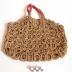 Description : Assemblage de cercles (diamètre 2,5 cm) faits en raphia et assemblés entre eux, deux anses en raphia tressé (18 cm) et recouvertes d'un tissu de réparation.