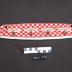 un dessin fait de carreaux de 1 cm blancs et rouges décore la face avant. Deux trous dans la plaque permettent de la suspendre au mur.