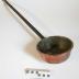 le pourtour de la tôle est refoulé vers l'extérieur pour faire un rebord, le métal a été martelé. Une tige métallique à section rectangulaire (L : 44 cm) terminée par un crochet fermé pour la suspension, est rivée sur le haut de la coupe par quatre rivets.