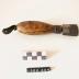 Description : Outil composé d'une partie supérieure en acier de forme rectangulaire avec un petit côté arrondis avec deux encoches pour lisser les champs de cuir. Montée sur un manche en bois tourné avec bague de serrage. Une languette de cuir est fixée à l'extrémité du manche (L du manche : 10 cm Dimension de l'outil : 3,5 x 2,5 x 1,2 cm)