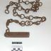 Description : Ustensile composé de : a/ 28 maillons de fer rond (D à?5 cm) affectant la forme d'un "8" dont le plan de la boucle supérieure est perpendiculaire au plan de la boucle inférieure (L d'un maillon 6,2 cm Lg : 3 cm, encombrement en ép : 3 cm, L des 28 maillons ensemble 148,8 cm : b/ à l'extrémité du dernier maillon, un lingot de fer quasi-parallélépipèdique (L : 12,7 cm, section carrée 2,1 x 2,1 cm) présente, du côté de la chaîne, une partie aplatie et plus large (Lg : 2,8 cm ép : 2 cm), arrondie à son extrémité, et présentant un orifice circulaire (D 1,3 cm) qui reçoit le dernier maillon de la chaîne.