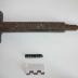 Description : Outil composé de : a) une pièce en acier tremoé, creuse, longiligne, sur plan rectangulaire (2,6 x 2,9 cm, L : 20,3 cm), aux arêtes biseautées, dont une extrémité, de section circulaire (D 3,5 cm) présente un trou carré (côté 2,1 cm, L : 3 cm), et en b2) une tête biseautée (L : 3 cm, Lg : 2,9 cm, ép maxi 2,2 cm, mini 0,6 cm) ; c/ l'autre extrémité de (a) présente un orifice circulaire (D : 1,6 cm) dans lequel coulisse un fer rond (L : 26,7 cm D : 1,1 cm) dont l'extrémité qui ne ressort pas est carrée (côté 1,6 cm), l'autre extrémité de cette tige c) présentant un diamèter plus important sur 3,8 cm de long (D : 1,6 cm), avant de se terminer en une pointe conique filetée profondément (vrille) (L : 2,7 cm D maxi 0,9 cm)