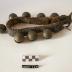 Description : Grelottière composée d'une lanière de cuir de forte épaisseur terminée par 2 boucles en métal avec un élément de fixation. L'intérieur de la lanière est redoublé d'une autre épaisseur de cuir découpée, sur les 2 revers, de triangles. Présence de 2 passants en cuir, un à chaque extrémité.