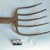 Description : Fourche à 5 dents incurvées vers le manche. Elle est munie d'une douille obtenue à la forge en étirant et aplatissant la matière puis en la cintrant pour obtenir un tube fermé. La douille est percée d'un trou par où doit passer un clou de fixation du manche (absent).