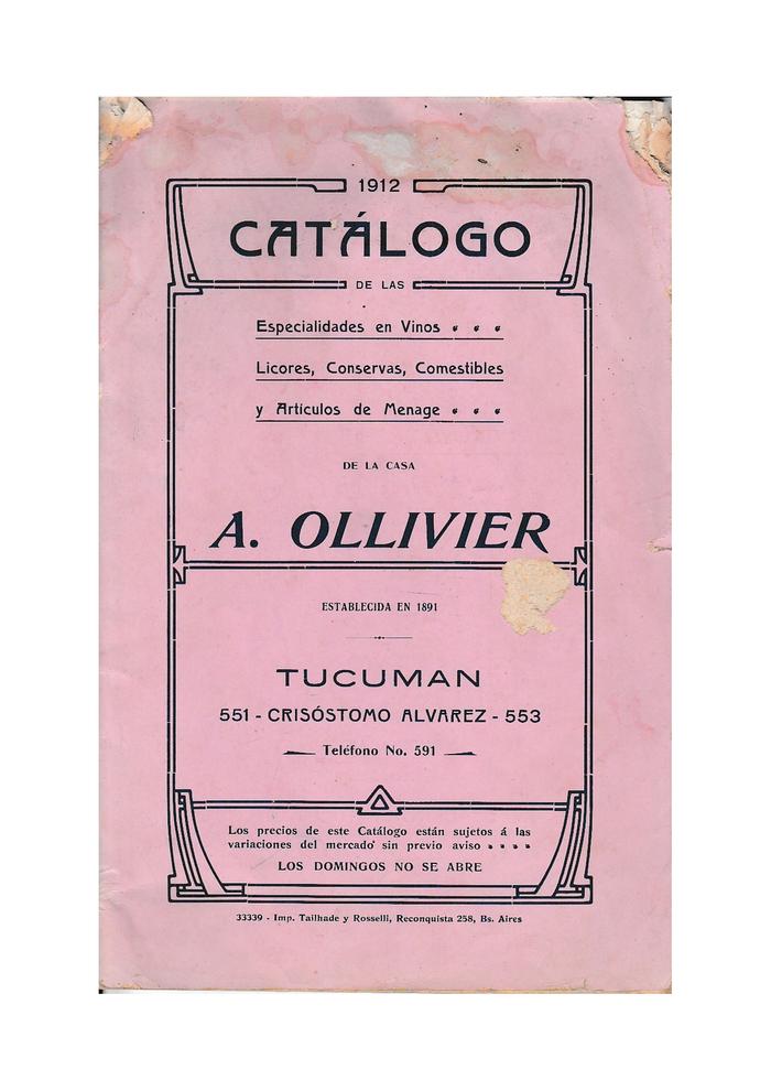 [1912 - Catàlogo de las Especialidades en Vinos, Licores, Conservas, Comestibles y articulos deMenage de la casa A. OLLIVIER- Tucuman]