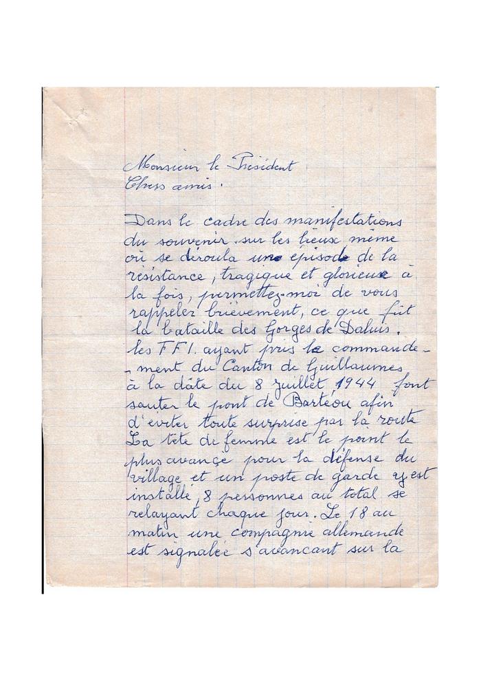 Description : Voici le support d'un discours pour la commémoration du cinquantenaire de la Libération de Guillaumes en Juillet 1994, discours adressé à Mr André Galtier, Président de la section locale des anciens combattants et prononcé devant la stèle commémorant les combats qui eurent lieu dans les Gorges de Daluis au niveau du rocher appelé la tête de femme, la gardienne des Gorges, le point le plus avancé pour la défense de Guillaumes après que les F.F.I. ont fait sauter le Pont de Berthéou* le 8 juillet 1944.