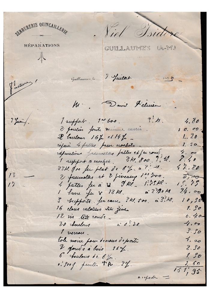 [Facture des établissements Isidore Niel à Guillaumes. Serrurerie - Quincaillerie - Réparations. 1923]