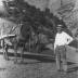 [Homme avec un chapeau de paille et mule attelée à une charrette de foin, Bouchanières ?]