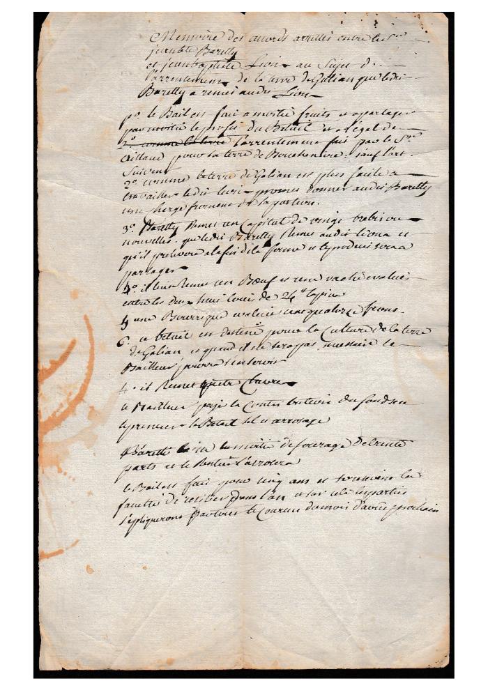 Description : Mémoire des accords passés entre Jean Baptiste Baréty et Jean-Baptiste Lions au sujet de l'arrentement de la terre de Galian. Dans ce bail de cinq ans, Barety demande le partage de la récolte de fruit et par moitié le profit du bétail.