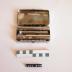 Description : 1/ Boîte rectangulaire aux angles arrondis contenant deux compartiments solidaires de même volume reliés entre eux par une charnière dans le sens de la longueur et se fermant par un système de crochet à ressort. Dans la partie inférieure se trouve un anneau (H : 0,5 cm) pouvant tenir un tube droit.