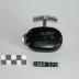 Description : Lampe composée d'un boitier en bakélite noir de forme cylindrique étroit. Les deux côtés sont plats ovales. Sur un côté du cylindre à l'avant est fixé un verre semi-sphérique diffuseur à l'intérieur duquel est vissée une ampoule : la partie inférieure du cylindre est munie d'un bouton pressoir plat légèrement concave fixé à un support mobile entrant dans le boitier.