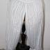 Description : Culotte rayée en relief blanc bleu ciel et bleu marine. devant monté sur empiècement en travers en pointe avec fronces. Dos monté avec fronces sur une taille de 5,5 cm en travers plus une coulisse avec cordon ouvert des deux côtés par un bouton , fendue à partir de 13 m de la taille, bas de jambe resserré à 6 cm par un ... fil de 1,5 cm avec des fronces. Jambe terminé par une broderie à festons. Bas jambe 46, Cuisse 80, taille 76, hauteur 70 cm