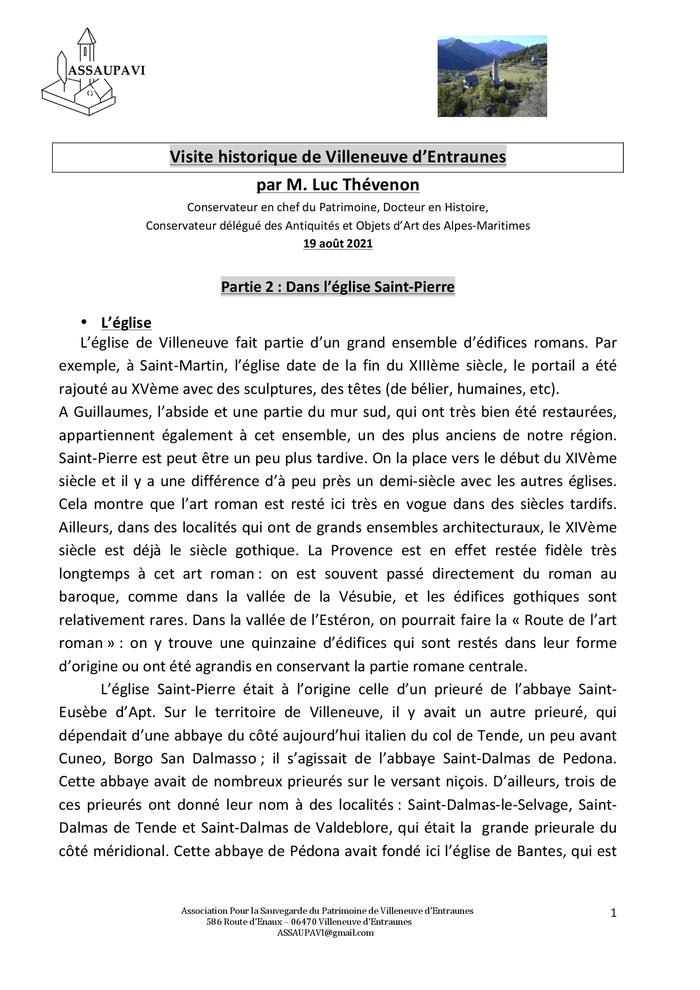 Description : 2ème partie d'une conférence donnée par Luc Thévenon lors d'une visite historique de Villeneuve d'Entraunes organisée par L'Association pour la Sauvegarde du Patrimoine de Villeneuve (Saupavi) 1. Luc Thévenon présente d'abord l'église paroissiale Saint-Pierre , dépendance à l'origine du prieuré Saint-Eusèbe de Saignon près d'Apt et analyse ensuite la fresque attribuée à Renato Ferrini, le tableau du Rosaire, les fresques et le bénitier décoré de têtes anthropomorphes.
