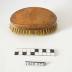 Description : Ustensile composé de : a) un support en bois, décomposable en a1) un dos sur plan elliptique (13,1 x 7,9 cm), convexe (ép. Maxi 1 cm, mini 0,1 cm). 6 vis régulièrement réparties sur le pourtour (il n'en reste plus que deux) assurent une fixation de ce dos sur le support des crins.