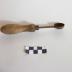 Description : Cuiller hémisphérique percée d'un trou en son centre reliée à un manche par une soie et une virole. Manche en bois galbé.