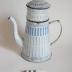 Description : Récipient à double corps. Le corps supérieur cylindrique (d:10,5cm h:11cm) présente un fond métallique percé de quantité de trous disposés en cercles concentriques. Il est surmonté d'un couvercle en forme de cône évasé (h:5,5cm). Le corps inférieur (h:20cm Dà la base:15,5cm Dau sommet :10,5cm) est en forme de tronc de cône. Il est pourvu d'une anse latérale fixe et verticale et sur le côté opposé d'un bec goulot. L'ensemble est décoré de traits bleu verticaux, plus ou moins épais et d'un motif floral stylisé de la même couleur.