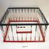 Description : Barrière déterminant un enclos fermé carré. Chaque côté du carré compte 10 barreaux. Sur un côté, les deux barreaux centraux sont sectionnés à 25 cm de haut pour laisser place à une barre en bois peint en rouge parallèle au sol et deux tiges de métal sur lesquelles glissent des boules en bois peintes en bleu, blanc, rouge. La traverse du sol est peinte en rouge et celle du sommet en bleu. L'ensemble est pliable