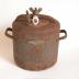 Description : 1/ marmite : cuve de section circulaire , à fond plat, à bord droit s'arrondissant sur le fond et le dessous. Ouverture sommitale ovale (16x13 cm). Poignées en métal rivetées à 13 cl du bas. Elles sont fixes avec une gorge sur l'extérieur.