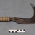 Description : Serpe dotée d'une lame large en bec de corbin, de fabrication industrielle (maréchalerie Isnard à Cuébris). Le manche est décoré de 5 rainures. La lame présente des traces d'aciérage au niveau de la jonction avec le manche.