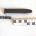 Description : Pièce de métal de section rectangulaire aux bords légèrement arrondis à tête martelée et taillant convexe (D à la corde : 1,1 cm)