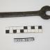 Description : Tige droite de fer plat, dotée, à l'une de ses extrémité d'une excroissance de forme elliptique, dans la partie extérieure de laquelle est pratiqué un orifice rectangulaire, au fond légèrement concave. Lg de l'orifice pratiqué dans la plaque elliptique : 2,1 cm