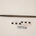 Description : Barre de métal ayant une section carrée. La section maxi est ici de 0,7 cm. Cette section maxi est considérée comme la "base" de l'outil, de laquelle part, d'un côté, une pyramide très allongée, tronquée (section à l'extrémité sup. 0,5 cm), comportant des stries sur chacune de ses faces. De l'autre côtés de la base, à 180° de la première pyramide tronquée part une autre pyramide ayant les mêmes caractéristiques, sauf qu'elle est plus fine et courte et lisse : il s'agit de la queue, que l'on peut introduire dans l'orifice d'un manche en bois. L partie striée : 17,8 cm