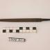 Description : Barre de métal ayant une section triangulaire. La section maxi est de 1,2 cm. Cette section est considérée comme la "base" de l'outil, de laquelle part, d'un côté, un tétraèdre très allongé, tronqué (section à l'extrémité 0,4 cm), sur les trois faces duquel sont gravées des stries. De l'autre côté de la base, à 180° de ce tétraèdre, part une pyramide régulière à base hexagonale, très effilée : il s'agit de la queue, que l'on peut introduire dans l'orifice d'un manche en bois. L partie striée : 13,3 cm. La queue porte des traces de peinture bleue.